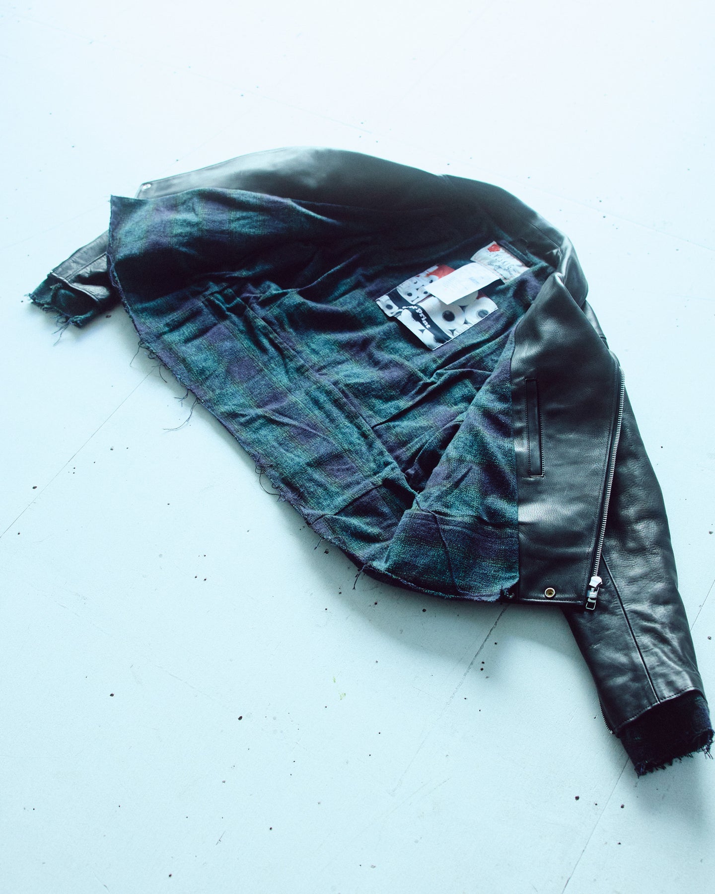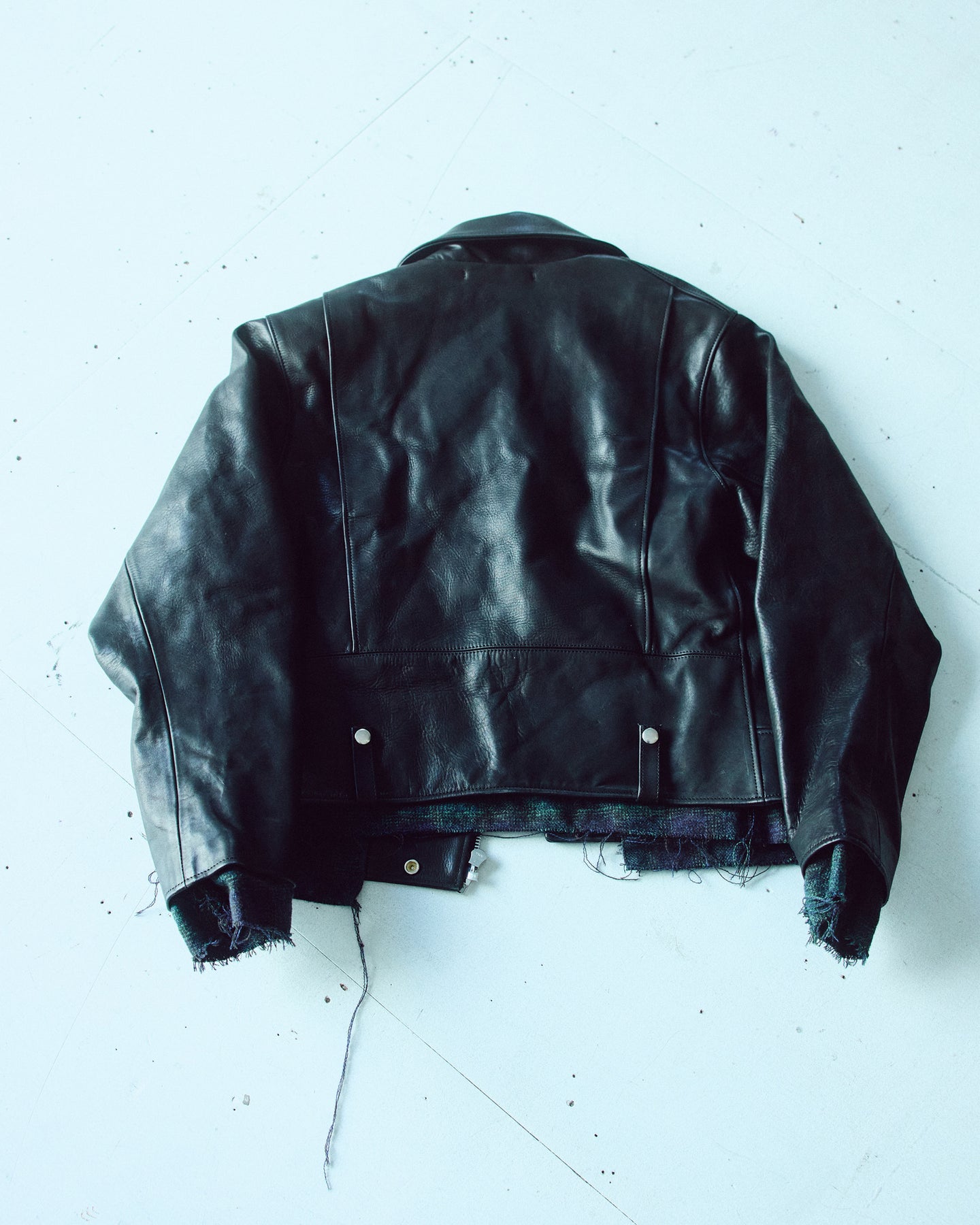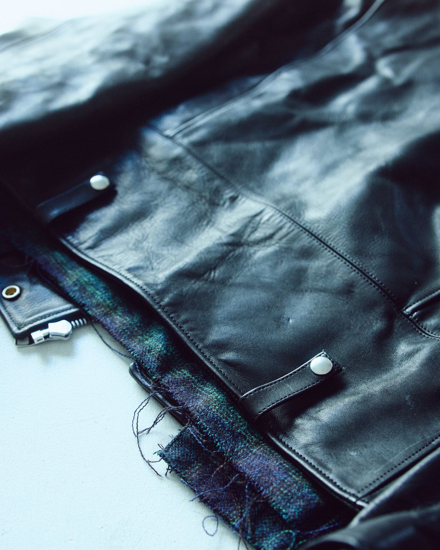 クラシカルなライダースのシルエットをベースに、裾から覗くチェック柄の生地をアクセントに加え、ヴィンテージ感とモダンなエッセンスを融合。