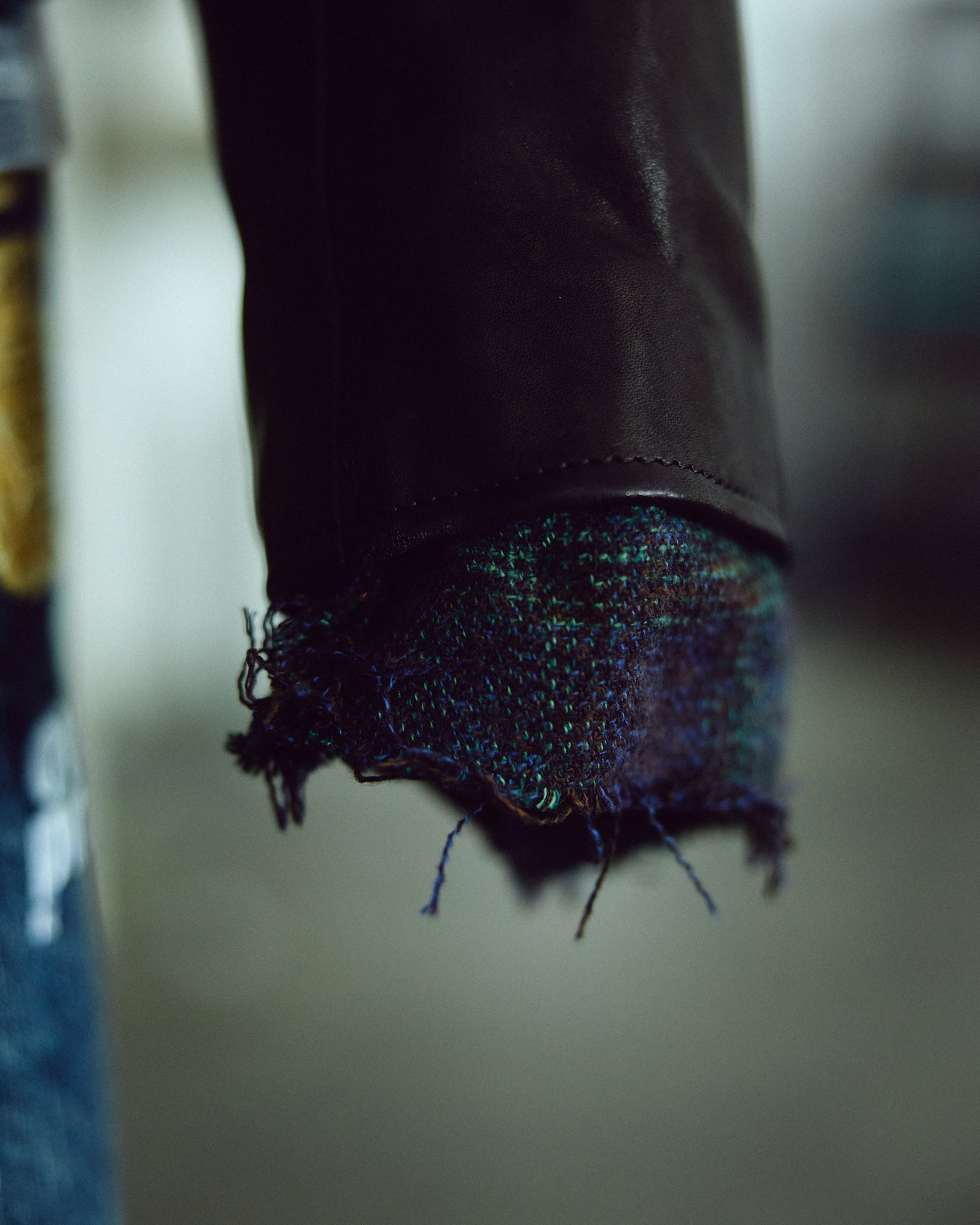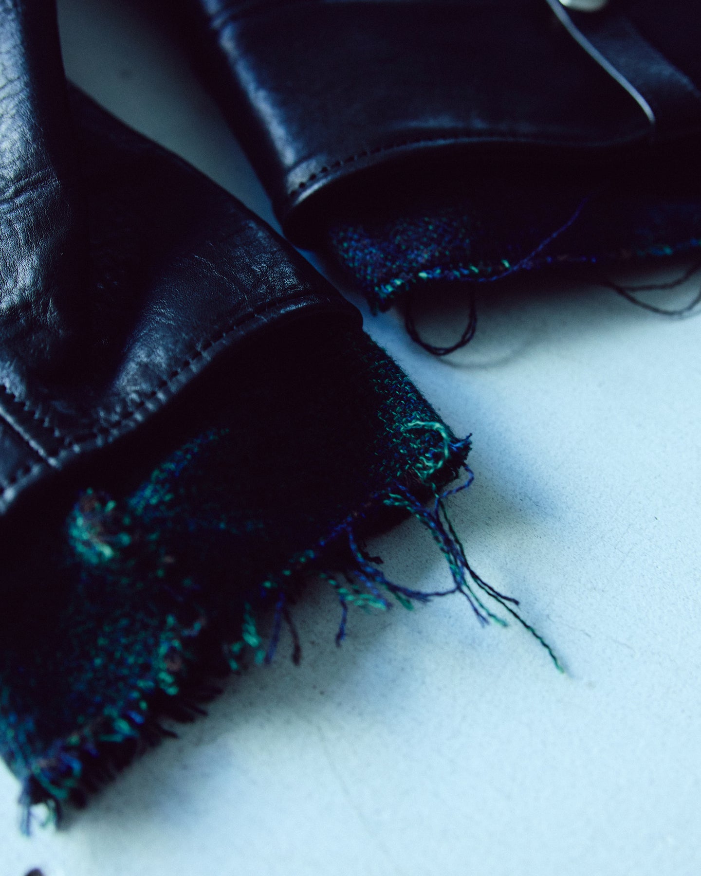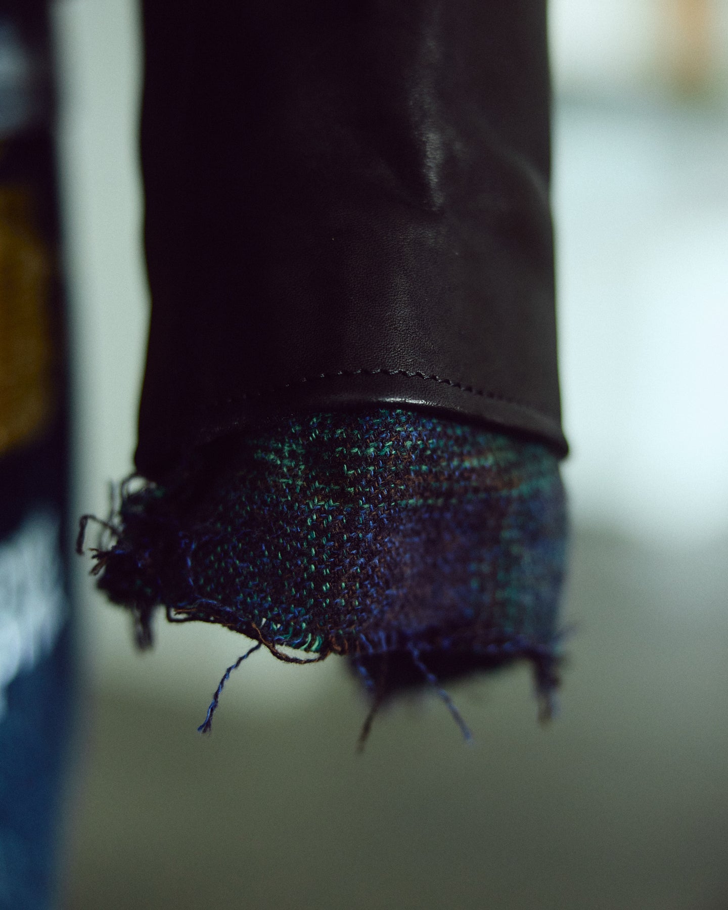 クラシカルなライダースのシルエットをベースに、裾から覗くチェック柄の生地をアクセントに加え、ヴィンテージ感とモダンなエッセンスを融合。