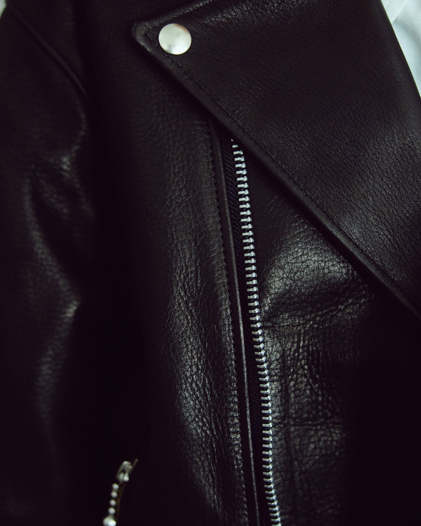 上質な日本産ホルスタイン原皮を、オリジナルの鞣し技法とスムース加工で仕上げたDポケットライダースジャケット。