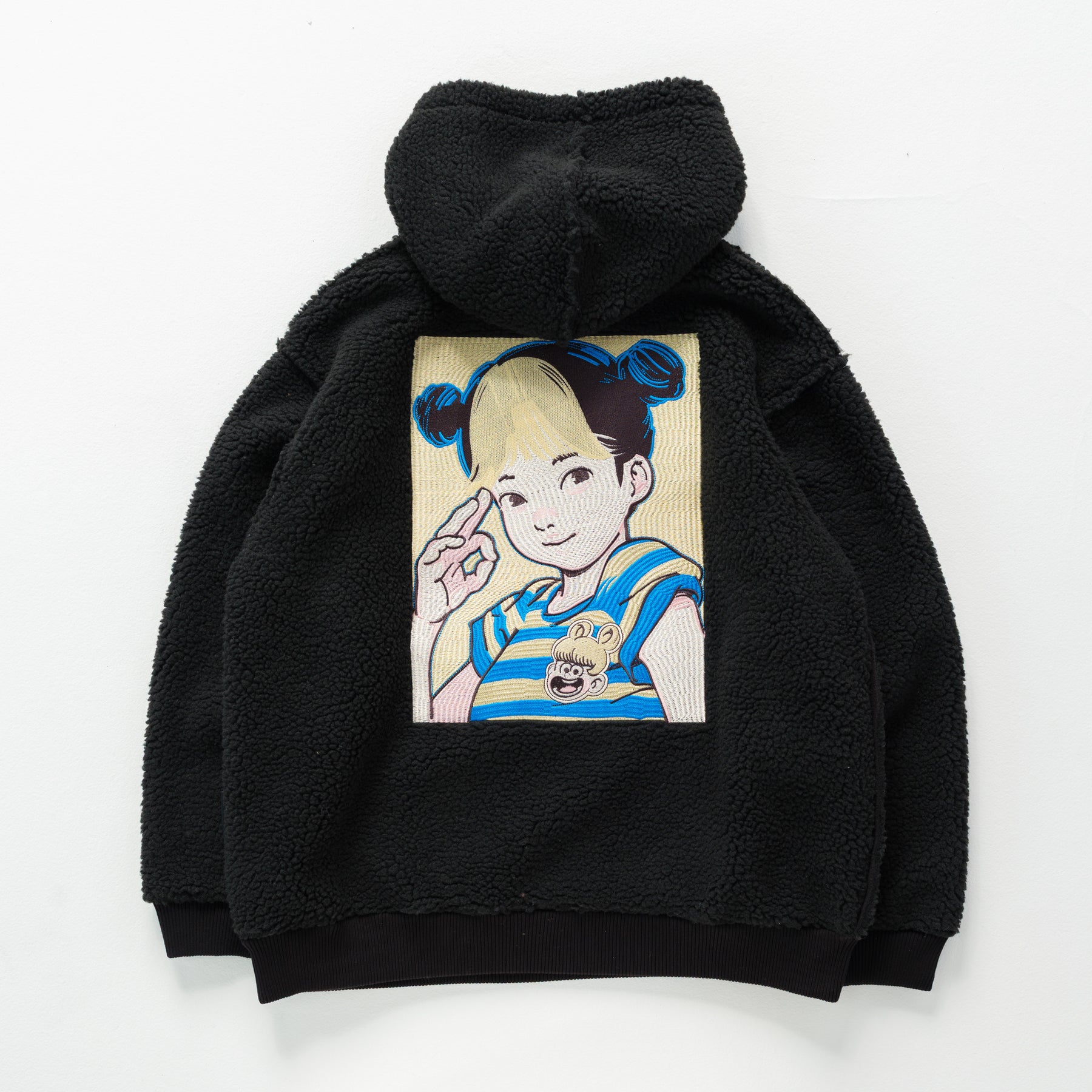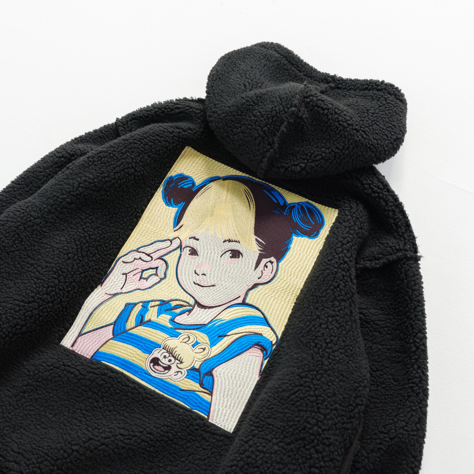 ボア生地の裏面にフリース生地をボンディング(接着)させたover printオリジナル生地を採用した、防寒性に優れた1枚