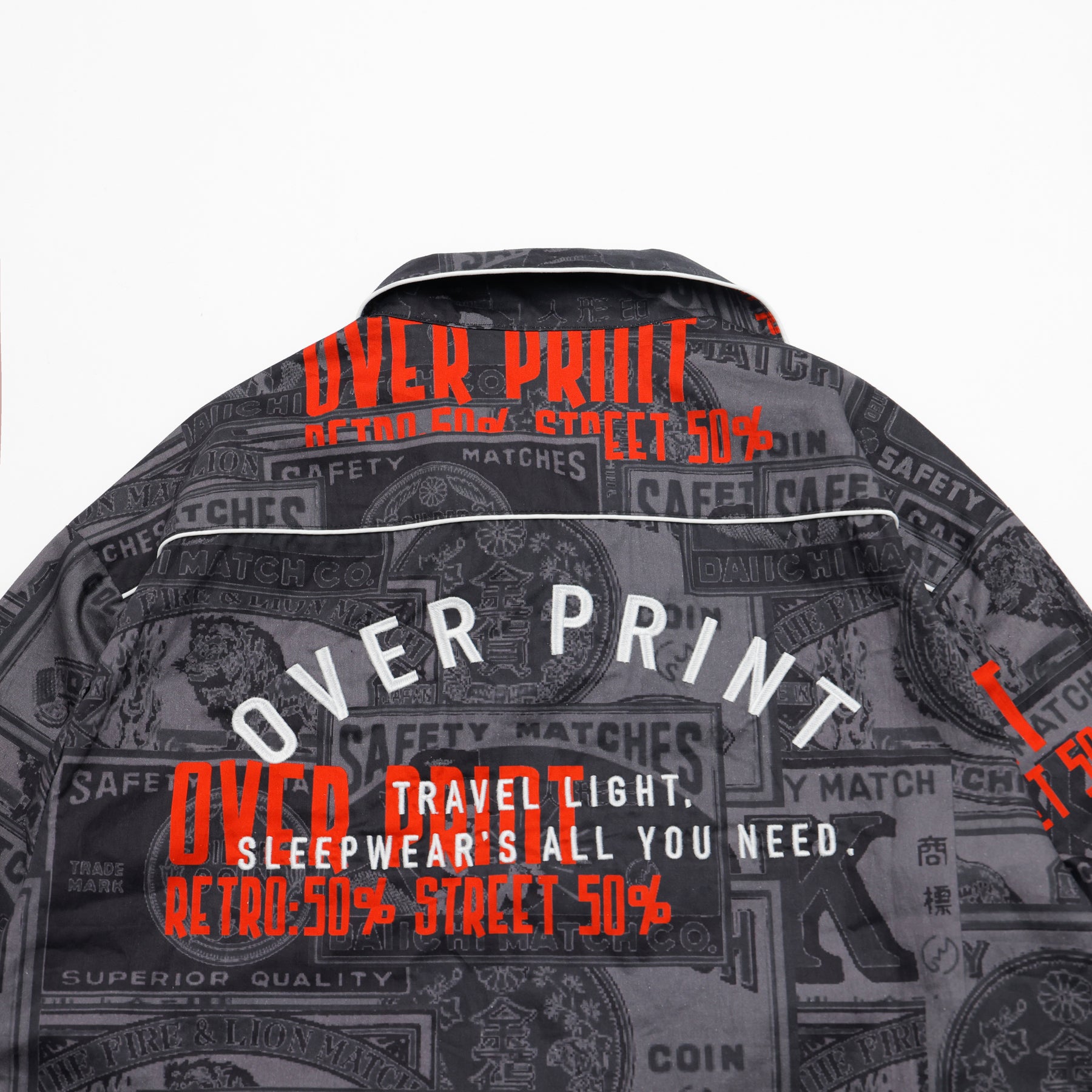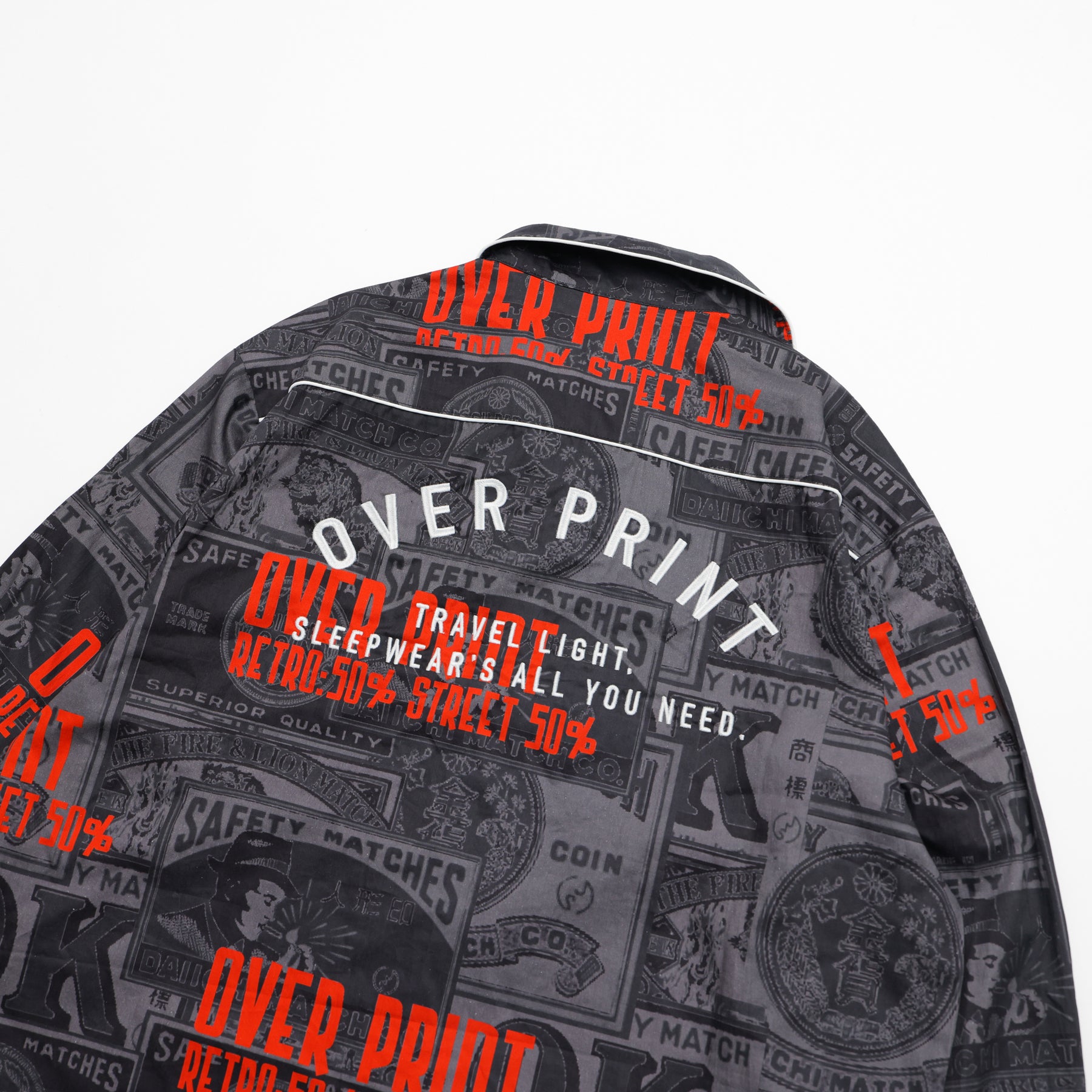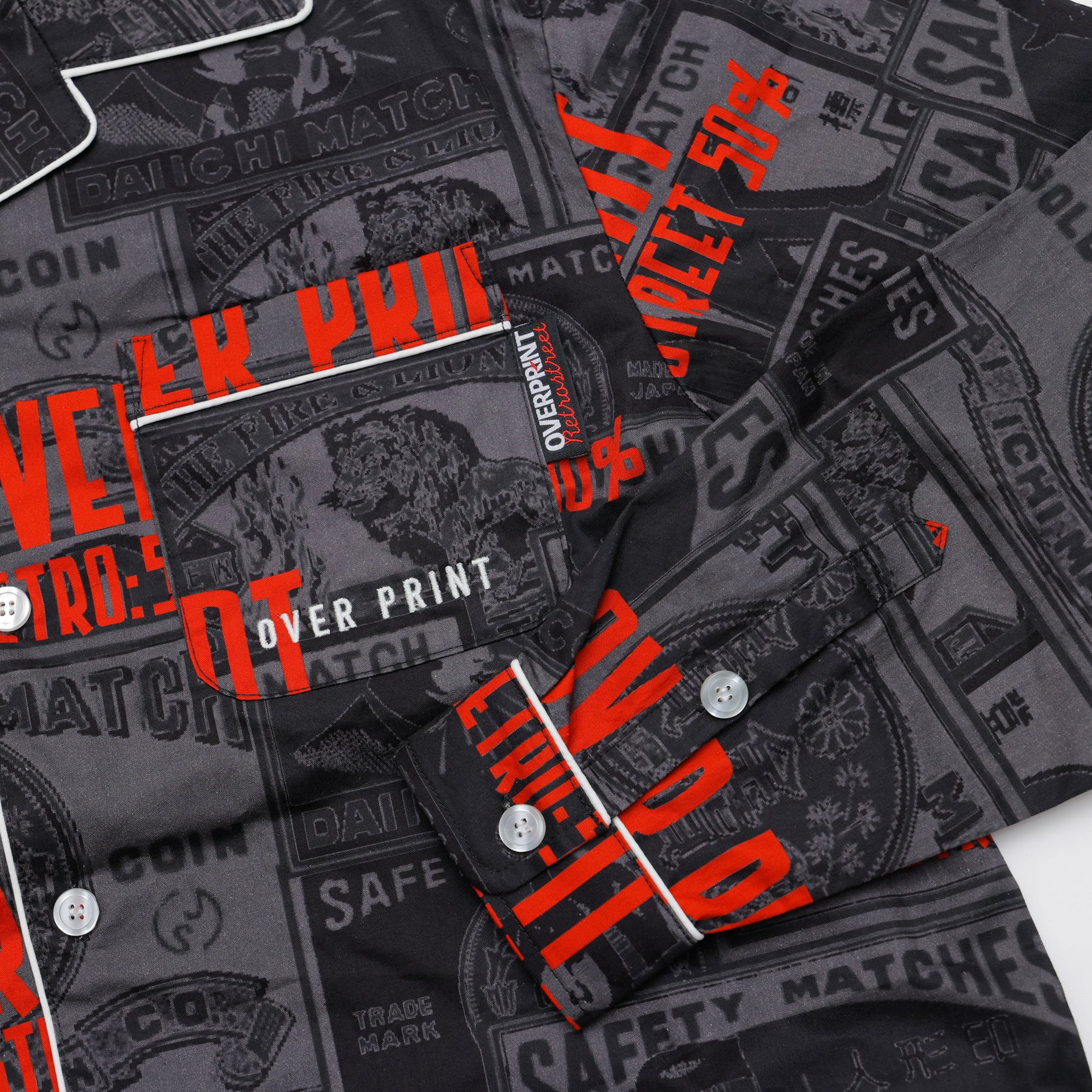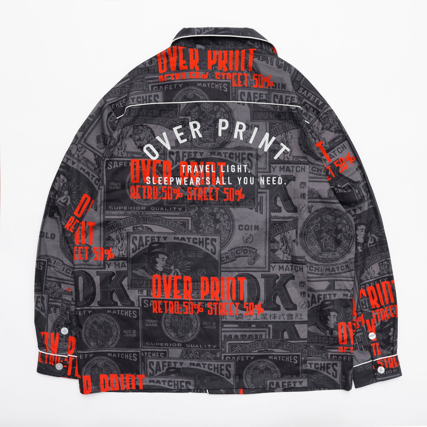 どこか懐かしいマッチラベルの総柄。 伝統的なマッチラベルのデザインを、over printらしい現代的な解釈でラウンジシャツへと落とし込む。
