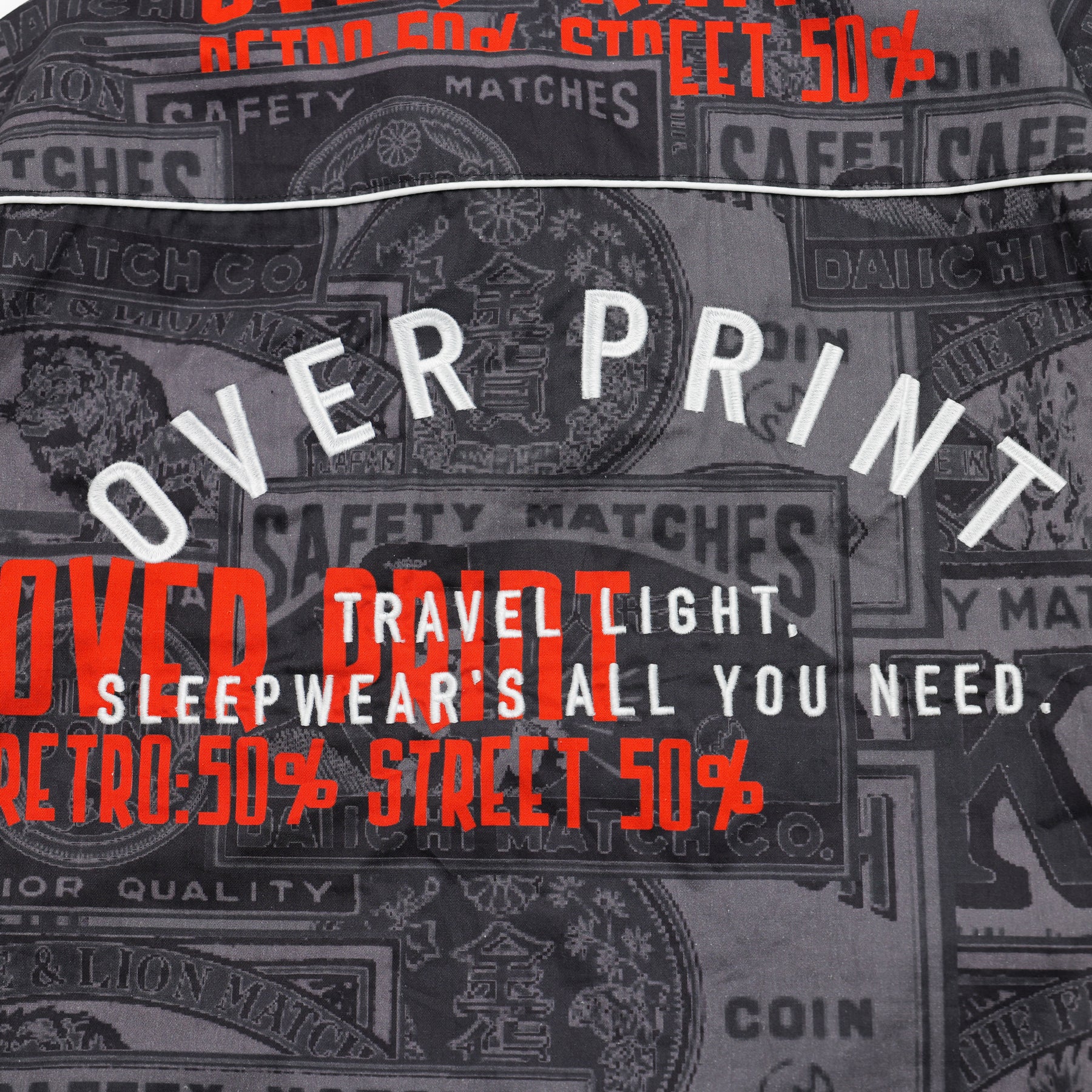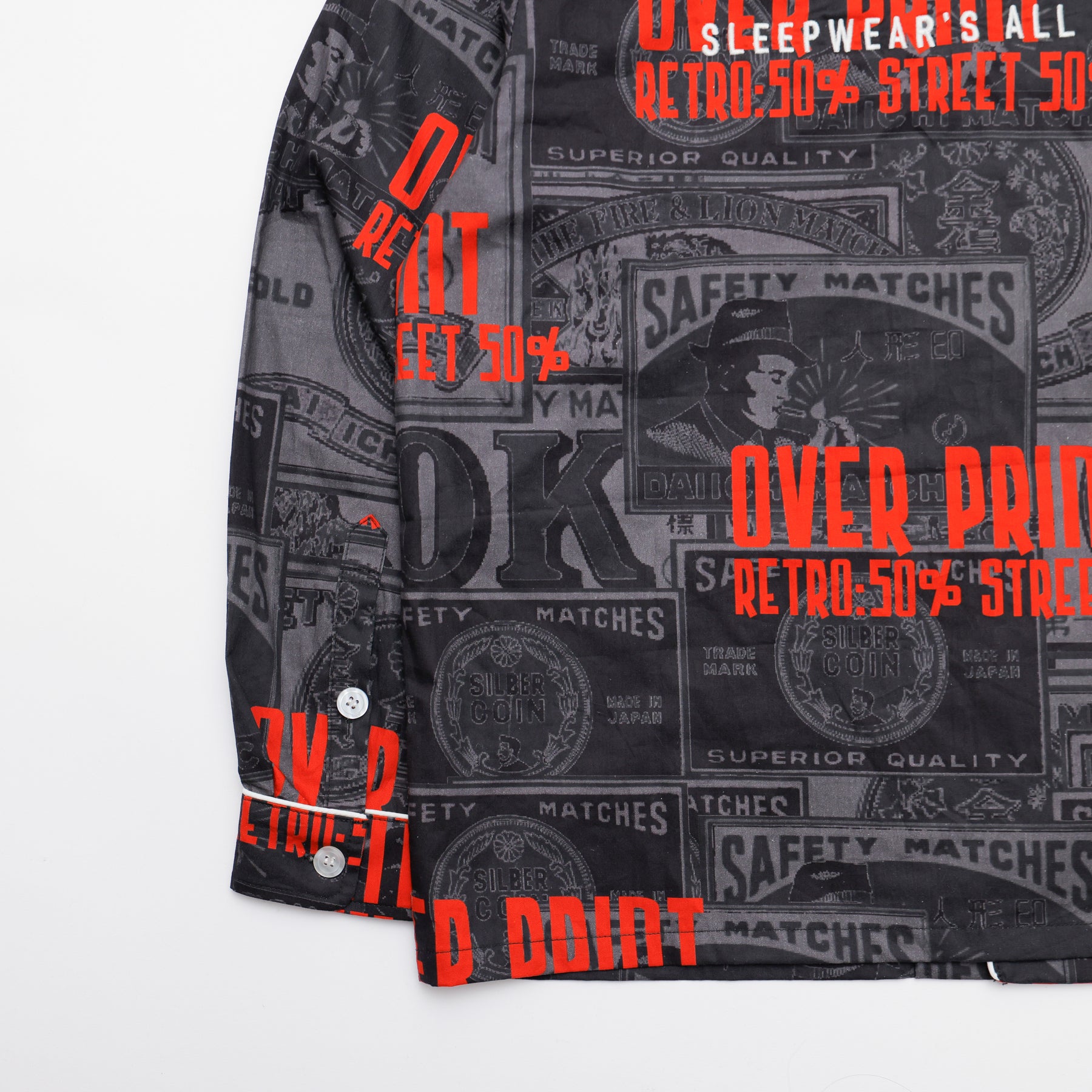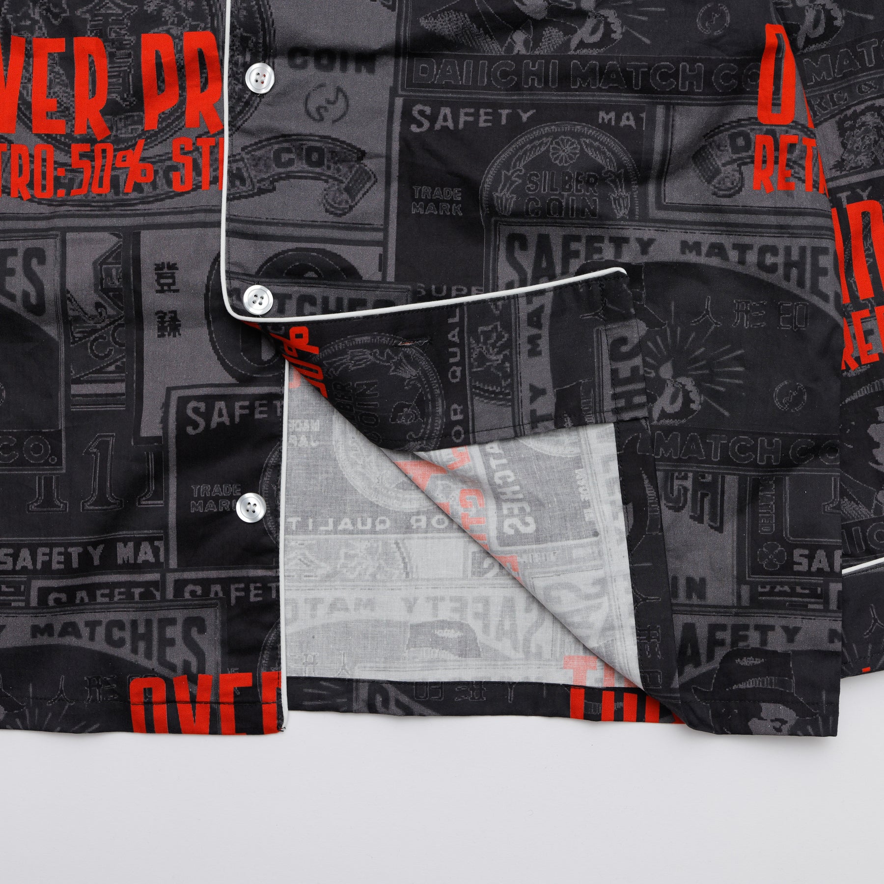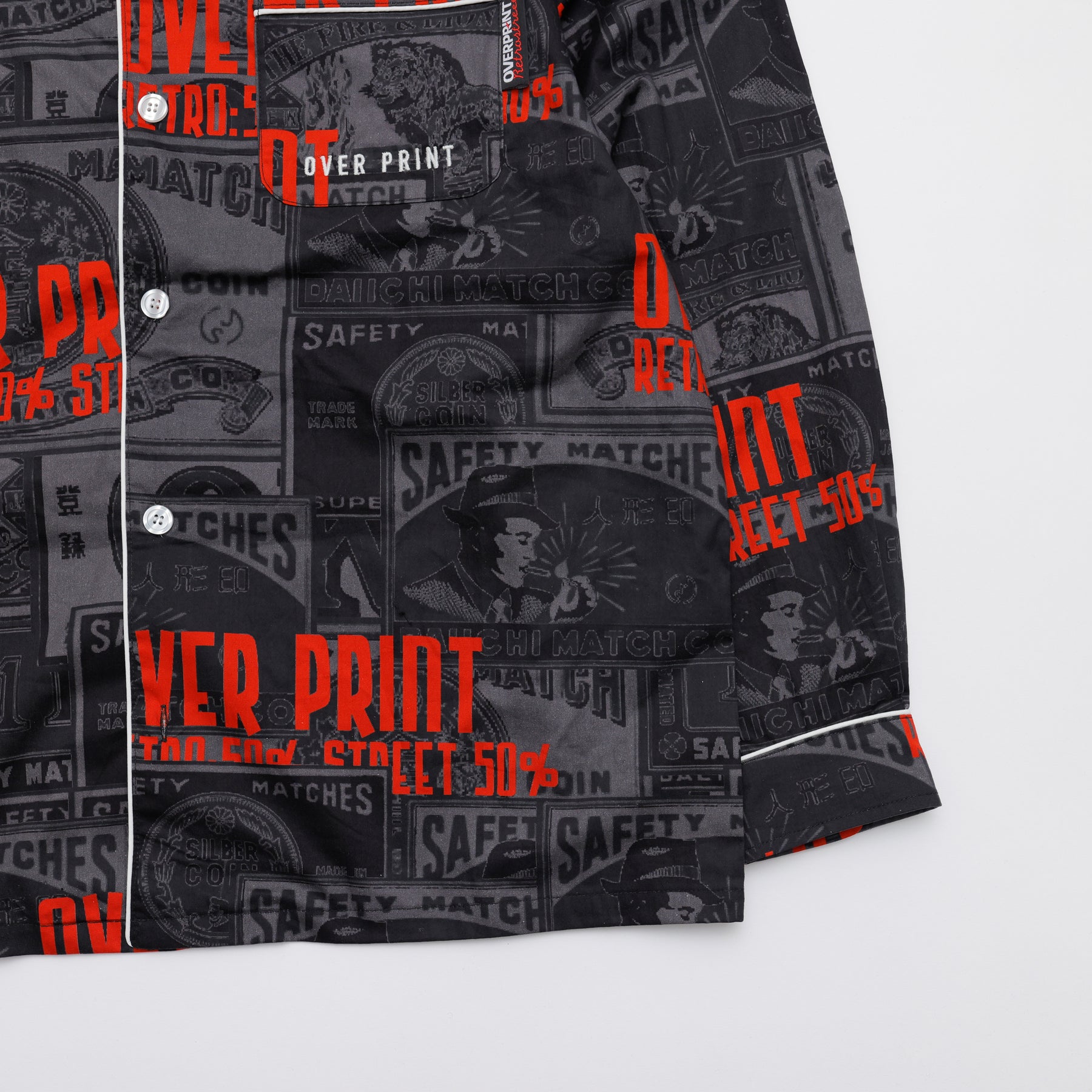 どこか懐かしいマッチラベルの総柄。 伝統的なマッチラベルのデザインを、over printらしい現代的な解釈でラウンジシャツへと落とし込む。