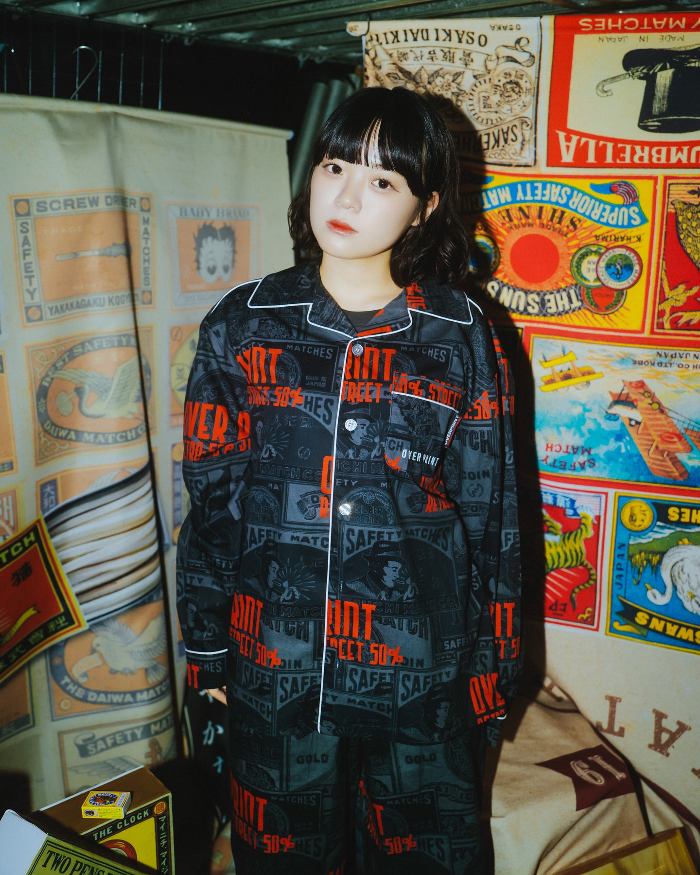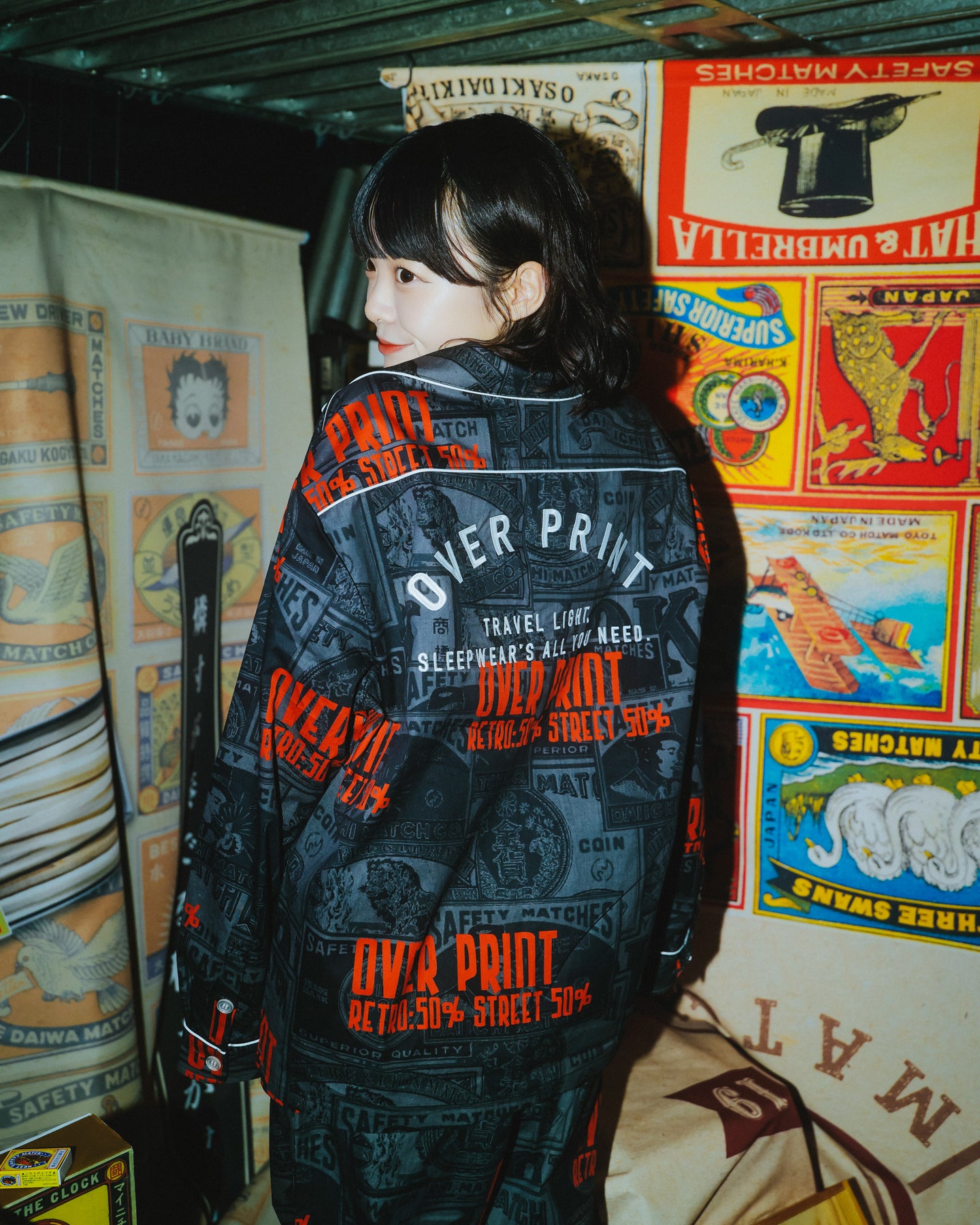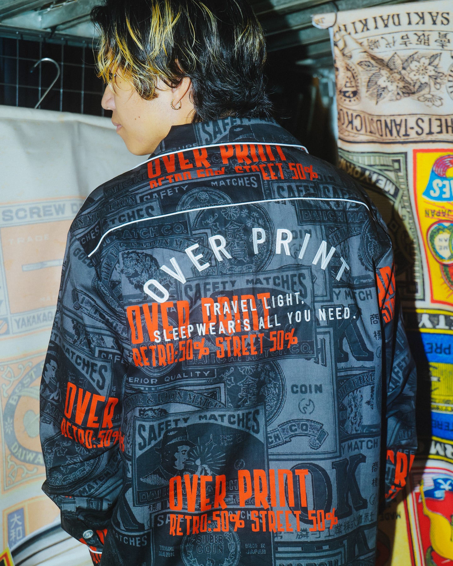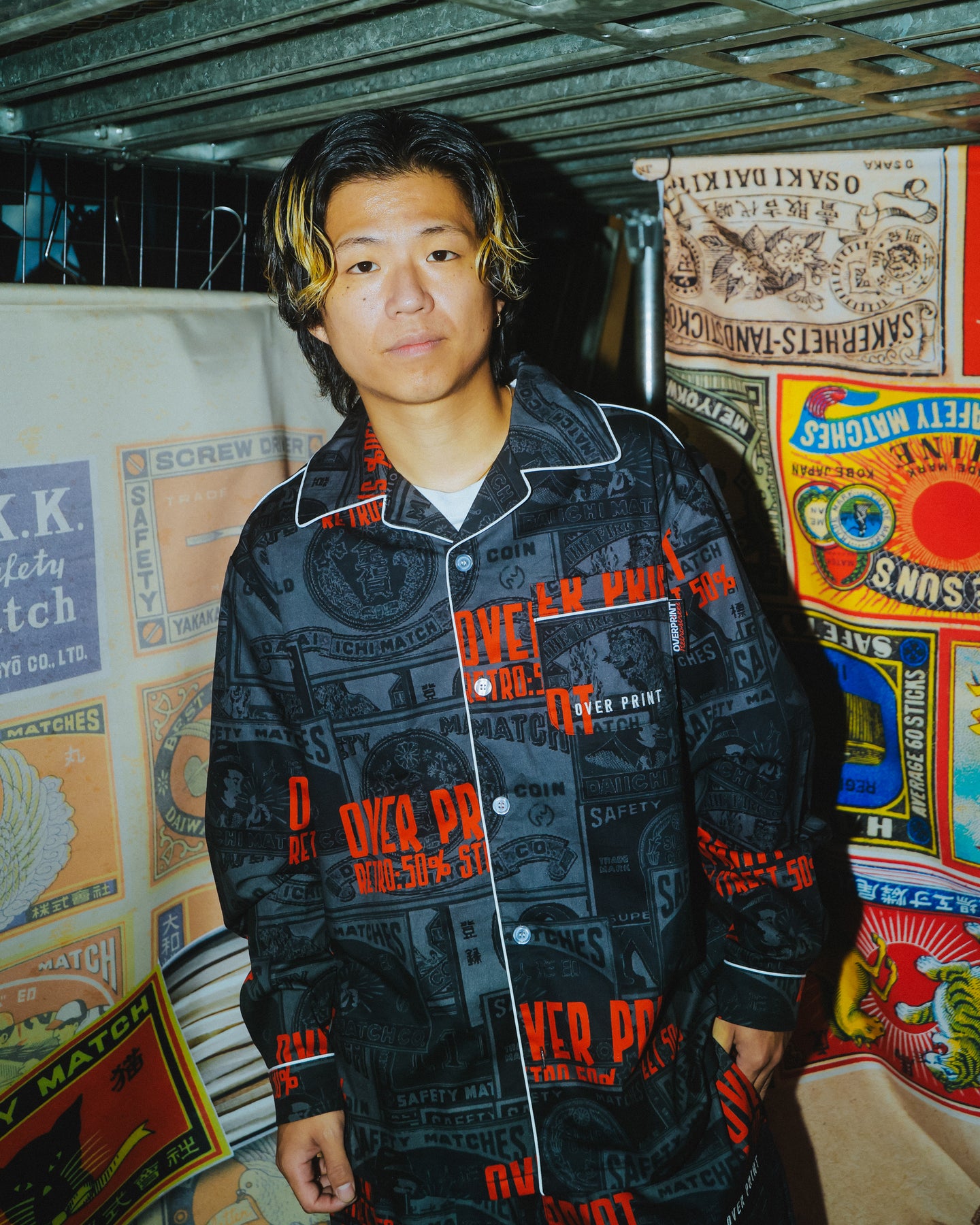 どこか懐かしいマッチラベルの総柄。 伝統的なマッチラベルのデザインを、over printらしい現代的な解釈でラウンジシャツへと落とし込む。
